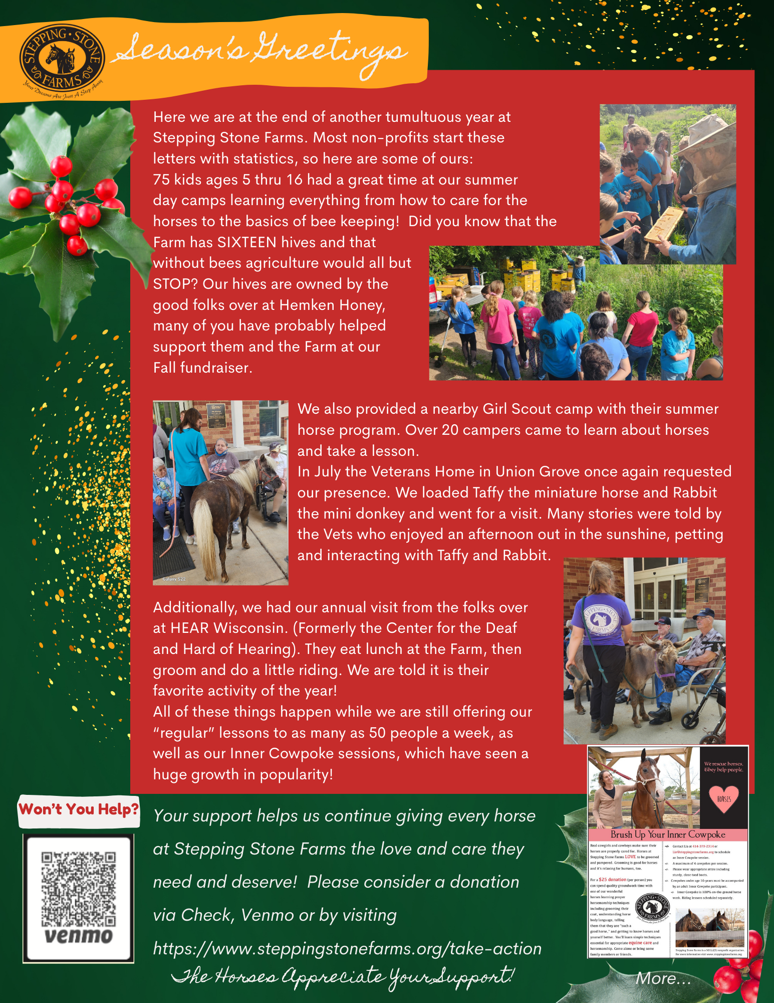 Stepping Stone Farms is a non-profit horse rescue and equestrian facility in Franksville that serves the needs of people in the South East Wisconsin area. In our Equine Assisted Coaching programs, people experience physical and emotional healing through riding and interacting with the horses, which can improve his or her self-esteem, relationship skills and quality of life. Stepping Stone Farms has been a shining forerunner in the Southeastern Wisconsin horse community since 2004.
