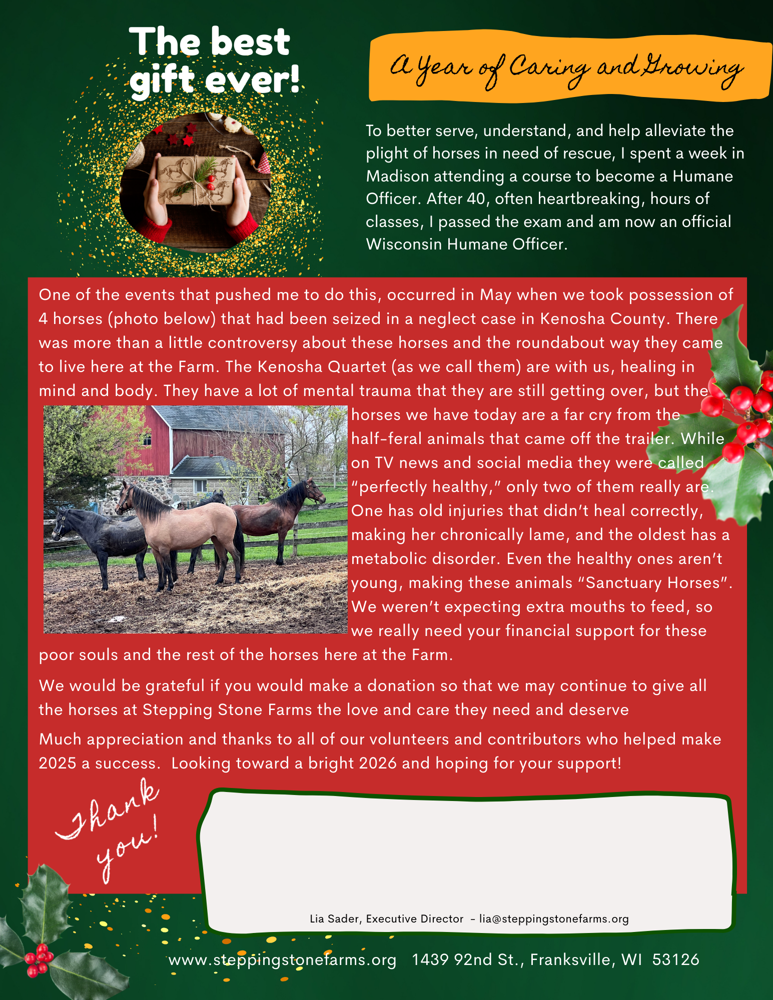 - Donating supplies - We have an ongoing need for good quality hay, shavings, etc. Check out our Wish List on our "Donate" page.